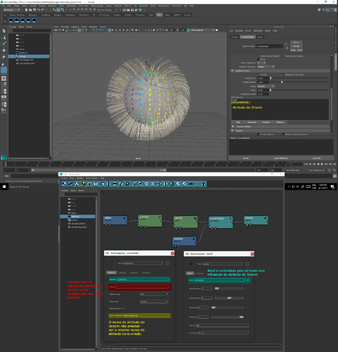 Seu primeiro input pode receber fios, partículas ou malhas, que irá carregar o atributo criado para frente no grafo. No segundo input entram Strands de Grooms ou Guide Curves, para que seus atributos possam ser passados para a nova variável criada.