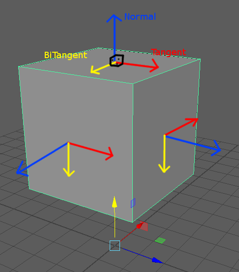Criará um vetor tangente à normal de cada fio. É muito útil para orientar instâncias e penas. O vetor Normal N é um vetor de direção [x,y,z] que fica perpendicular (forma um ângulo de 90 graus) com a superfície. Se negarmos o vetor N, invertemos a direção de sua Normal. O vetor Tangent é um vetor de direção auxiliar que fica perpendicular ao vetor N e segue rente à superfície. O vetor Bi Tangent é outro vetor de direção auxiliar ortogonal tanto a Normal quando a Tangent. O Yeti não cria este vetor Bi Tangent automaticamente, mas é possível reproduzi-lo com a função de Dot Product entre o vetor Normal e o vetor Tangent.