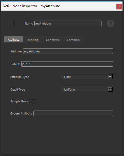 Para mapear uma variável para o Render, ative a opção Map as Renderable Attribute e coloque o nome de seu atributo nos dois campos abaixo. Este nome será usado no node que interpreta variáveis do renderizador, como descrito acima. Caso ele falhe para identificar a variável, seu valor default será utilizado. Uma maneira de verificar se a variável está funcionando é só alterar o valor default desse node e ver se ocorre uma mudança no Render. Se ocorrer, é porque ele falhou em encontrar a variável. Neste caso, verifique se tudo está digitado corretamente e se a versão tanto do Yeti quanto do Renderizador suporta esta função.