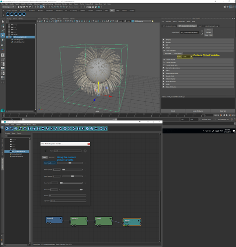 É possível criar Variáveis Globais Customizadas no node superior do Yeti, que se comportaram da mesma maneira que as já existentes. Na aba Graph->User Variables do node superior do Yeti, clicar em Add Float ou Add Vector para criá-las. Seu valor só pode ser alterado externamente, tanto sendo passado um valor numérico direto como ligado a algum parâmetro do Maya ou de seus objetos.