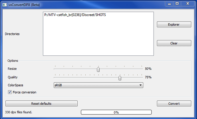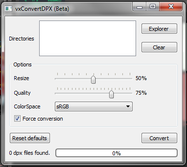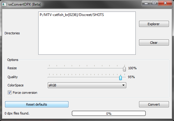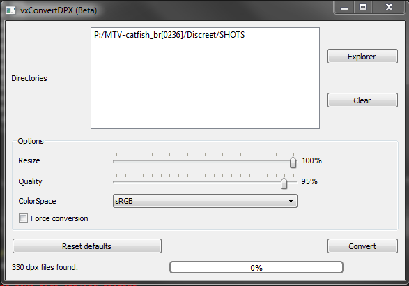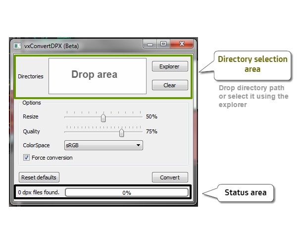 Status area: Where you can check the number of .dpx files found inside the selected directories, and the progress of conversion once it starts.
