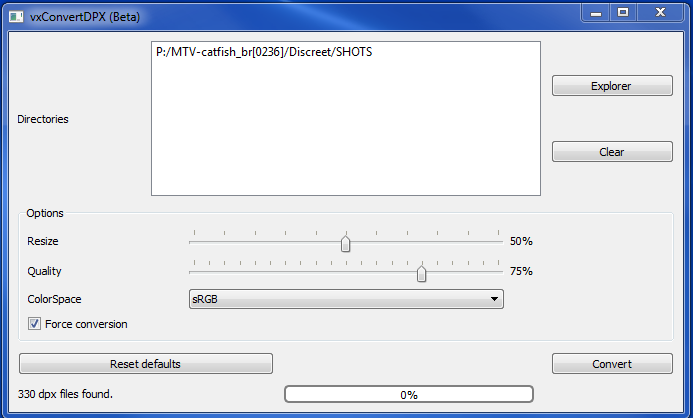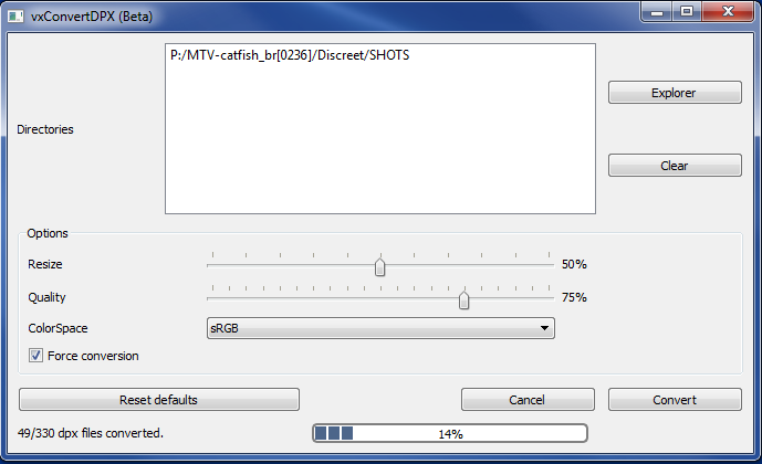 Options area: Where you can select the resize, quality and color space of the resulting .jpg files. You can also determine whether you want to force the recreation of .jpg files, in case they already exist. (Note: The .jpg files will be created inside a JPEG directory at the same level as the DPX directory.)