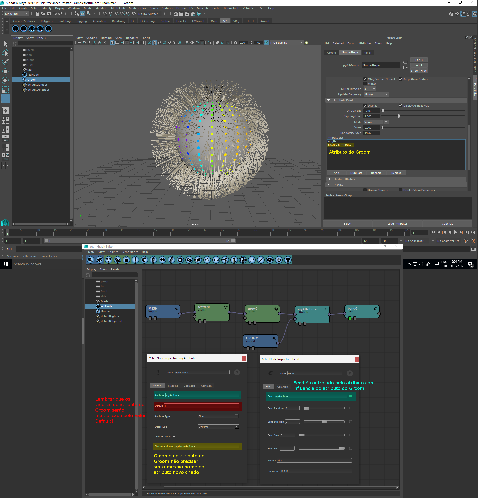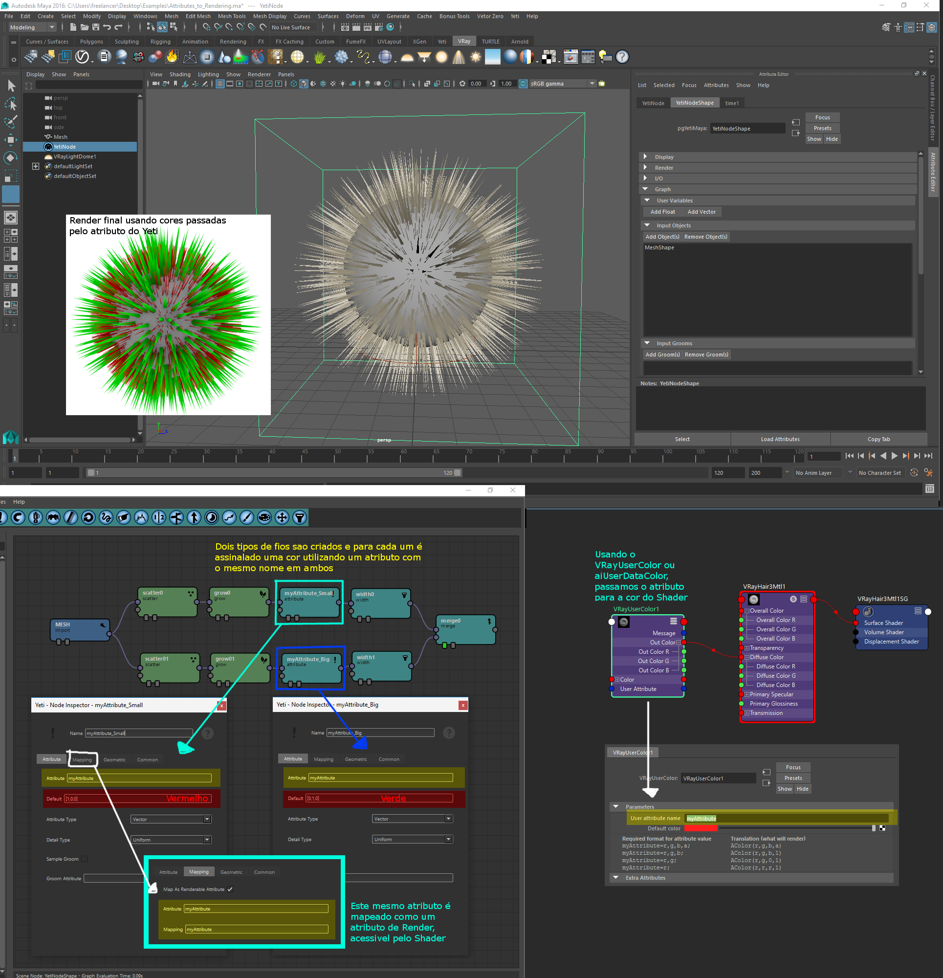 Para mapear uma variável para o Render, ative a opção Map as Renderable Attribute e coloque o nome de seu atributo nos dois campos abaixo. Este nome será usado no node que interpreta variáveis do renderizador, como descrito acima. Caso ele falhe para identificar a variável, seu valor default será utilizado. Uma maneira de verificar se a variável está funcionando é só alterar o valor default desse node e ver se ocorre uma mudança no Render. Se ocorrer, é porque ele falhou em encontrar a variável. Neste caso, verifique se tudo está digitado corretamente e se a versão tanto do Yeti quanto do Renderizador suporta esta função.