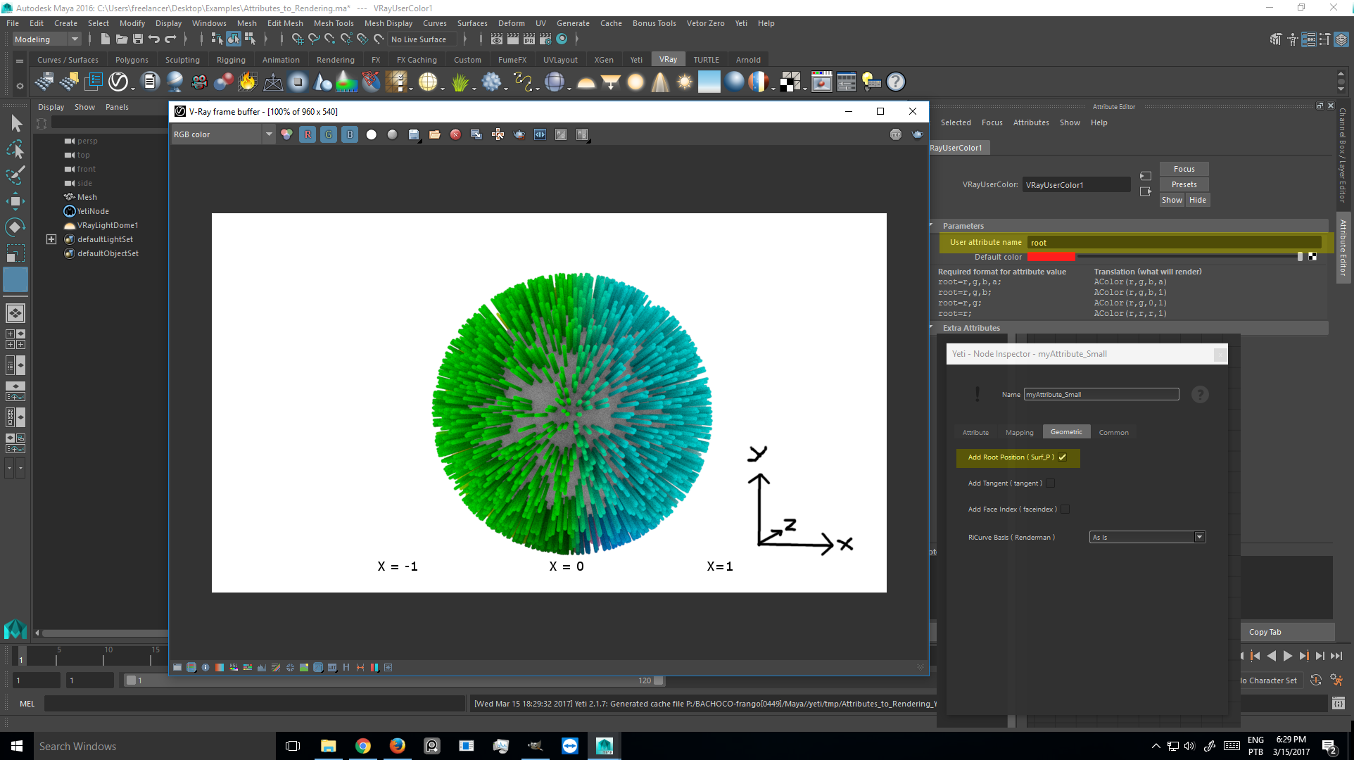 Cada renderizador possui o seu próprio node para interpretar variáveis de plugins ou internas do Maya. No VRay, estes nodes se chamam VRayUserScalar para Floats e VRayUserColor para Vectors. No Arnold, se chamam aiUserDataFloat para Floats e aiUserDataColor para Vectors.