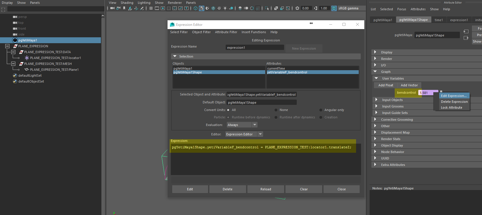 Para isso, clique com o botão direito em cima da variável criada e escolha “Edit Expression”. No Expression Editor é descrito o comando que será mandado para a variável. Neste caso, estamos pegando o valor de translação em Z do Locator 1 e assinalando para a variável bendcontrol.