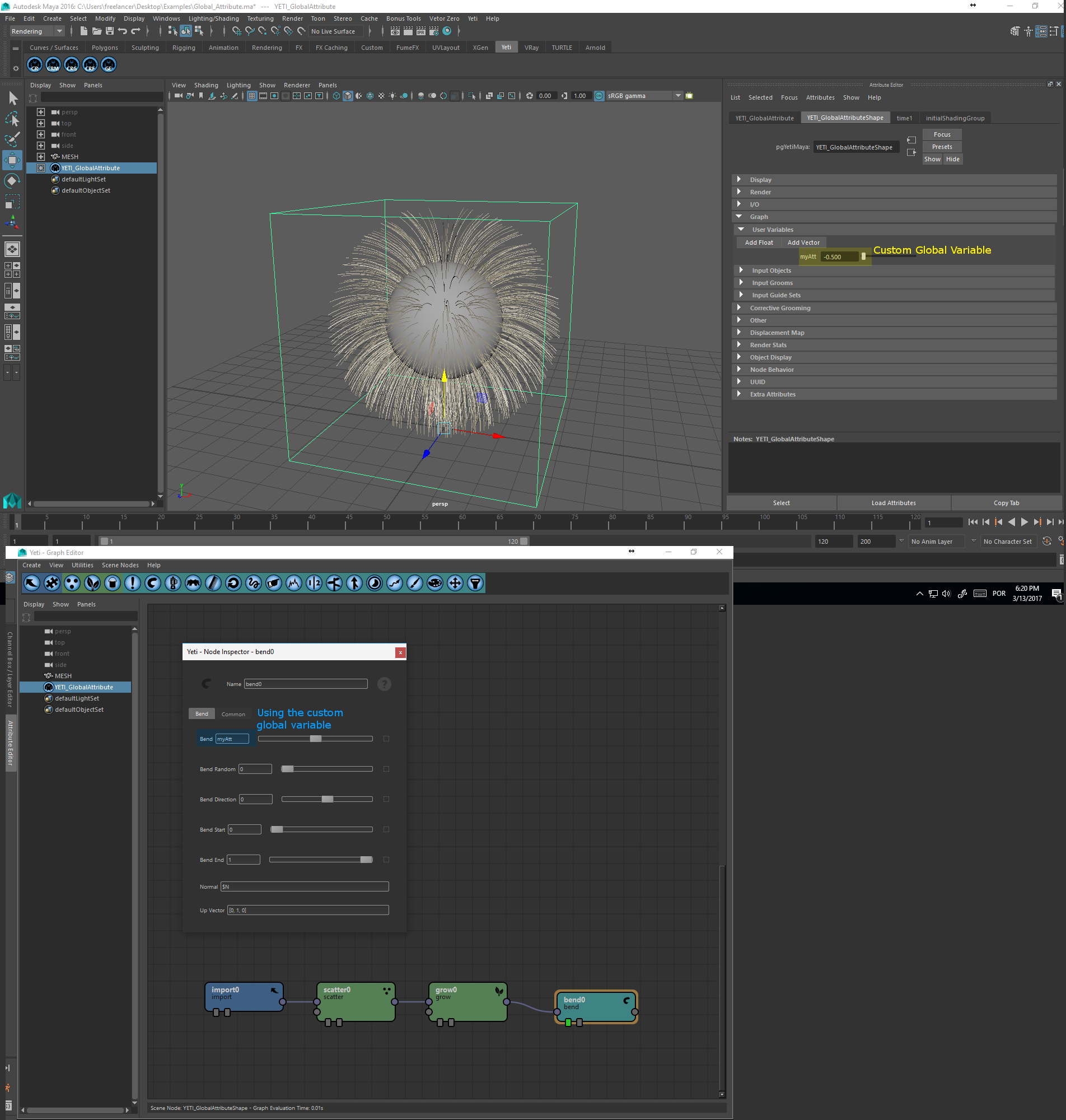 Neste exemplo, um valor passado pela Custom Global Variable chamado de “myAtt” é chamado dentro de um node interno da tree para controlar um parâmetro de bend. Este atributo pode ser usado em qualquer campo de qualquer node do Yeti.