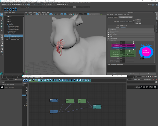 Uma maneira de se obter as vantagens de cada método é criar um sistema na qual o Guide Set controla a deformação das guias do Groom, mas todos os atributos são criados e controlados pelo Groom. Assim podemos animar um Groom.