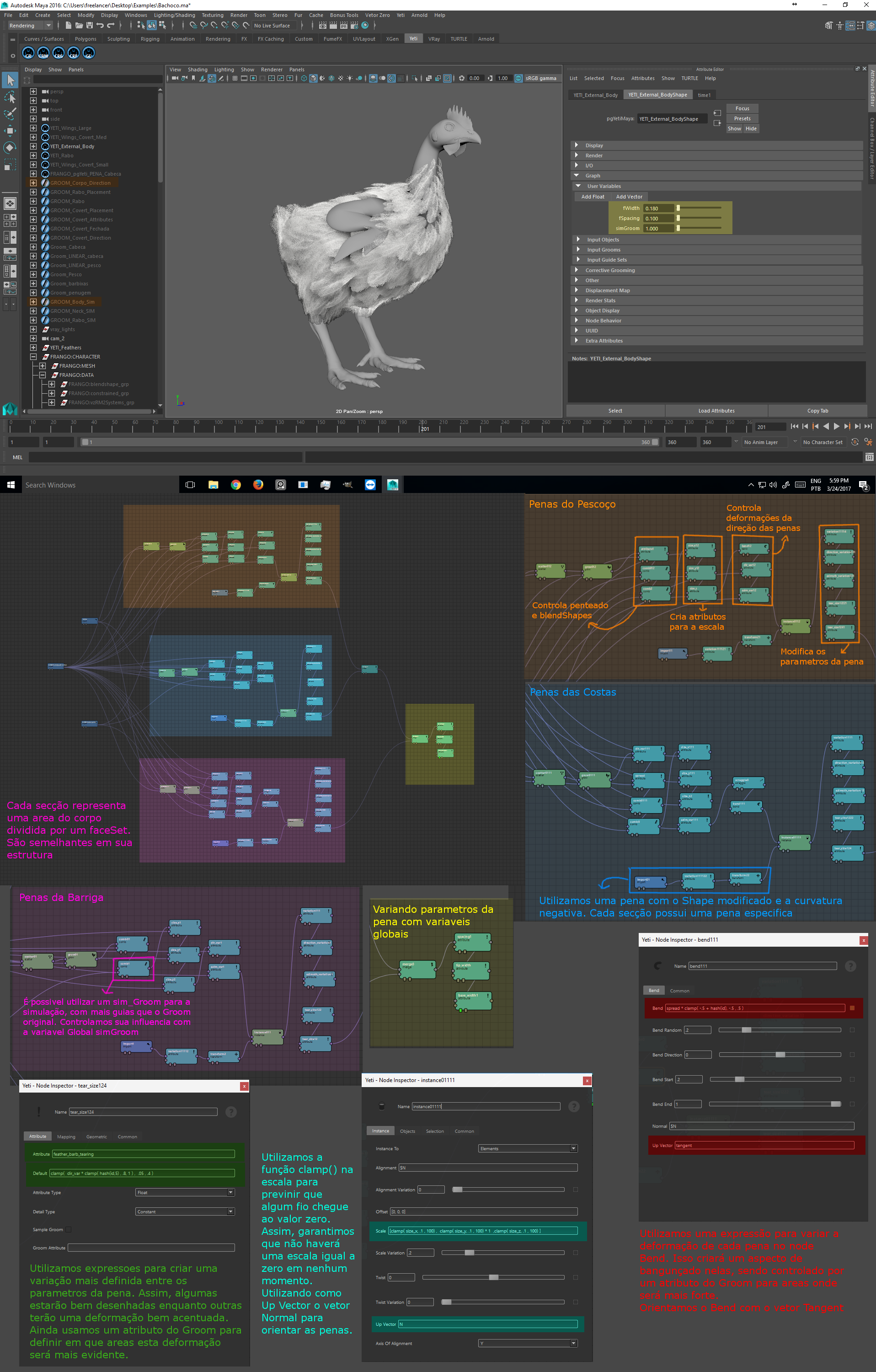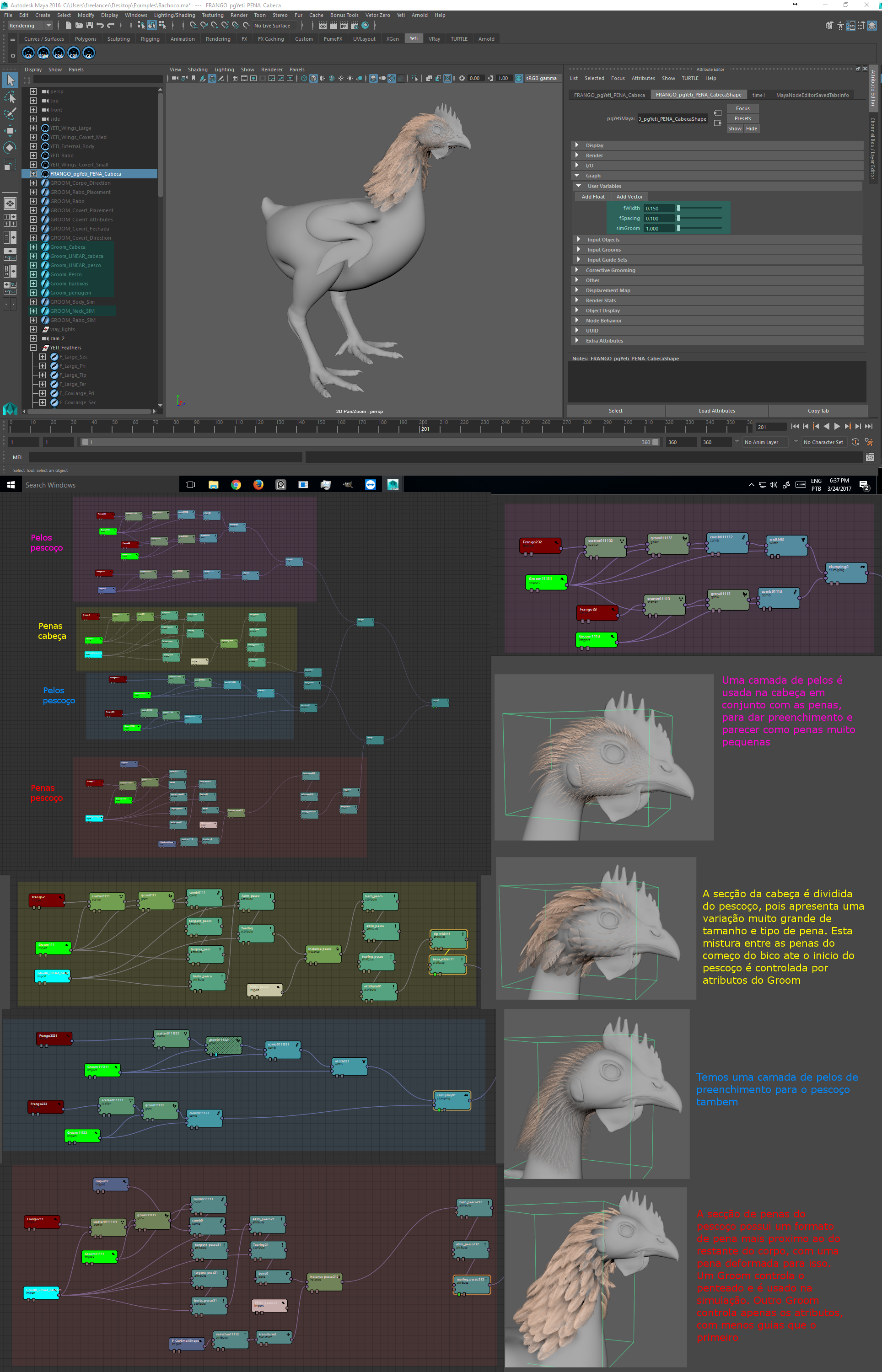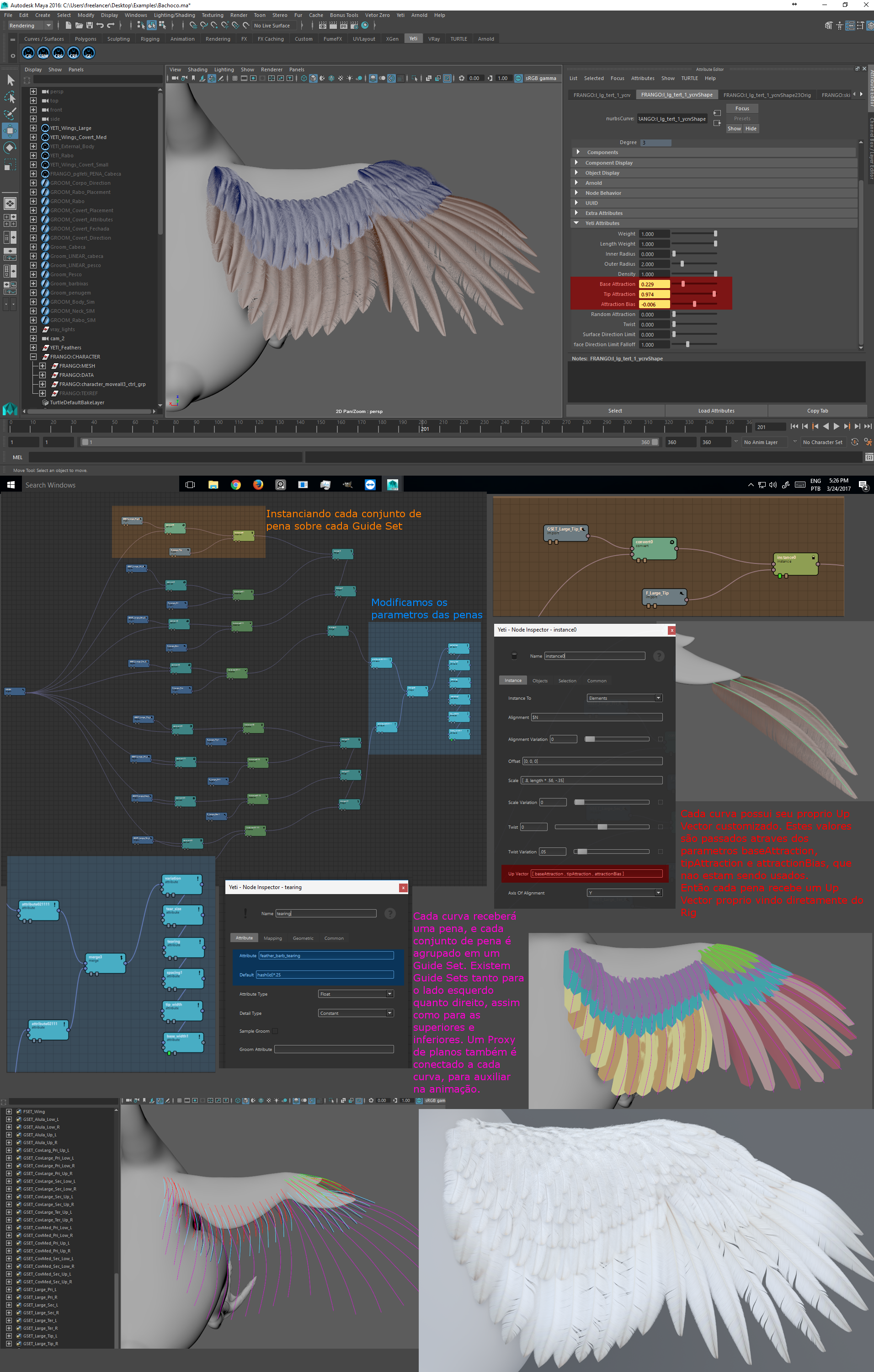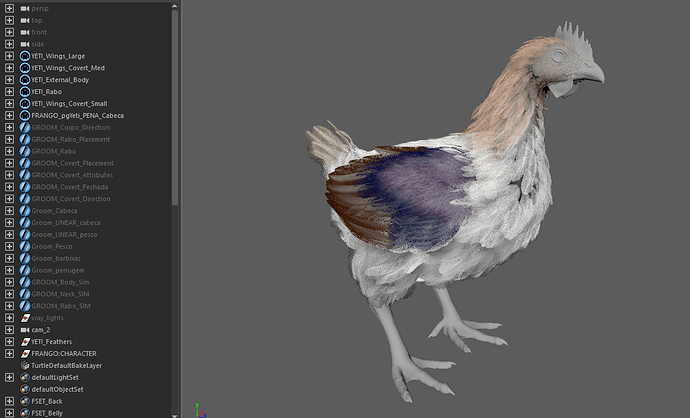 Suas penas são todas feitas pelo próprio Yeti, usando sua pena interna procedural. Assim, cada pena possui uma variação única e vários tipos de penas são usados para cada área do corpo.